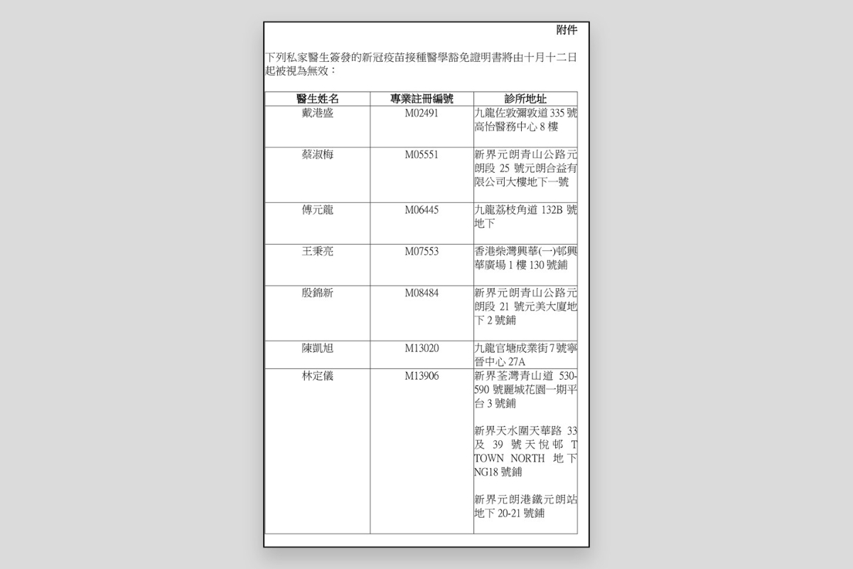 港府公布涉濫發“免針紙”的7名私家醫生名單分享到: