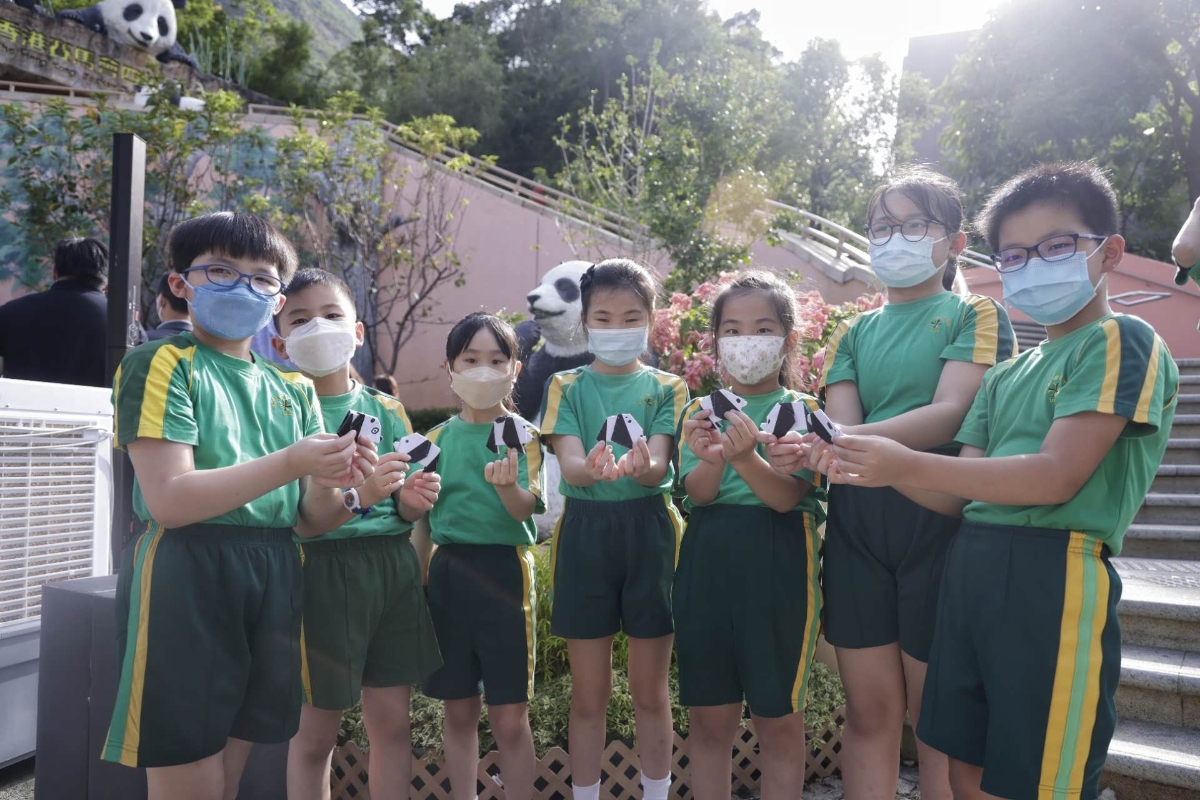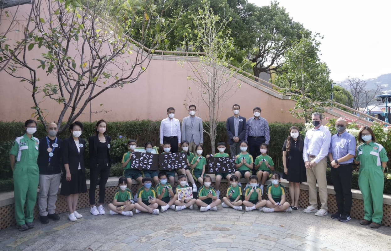 香港文化體育及旅遊局局長楊潤雄(後排左二)、香港海洋公園公司主席龐建貽(後排右二)等人與嘉賓以及各學生合影。 【編輯:曹文毓】