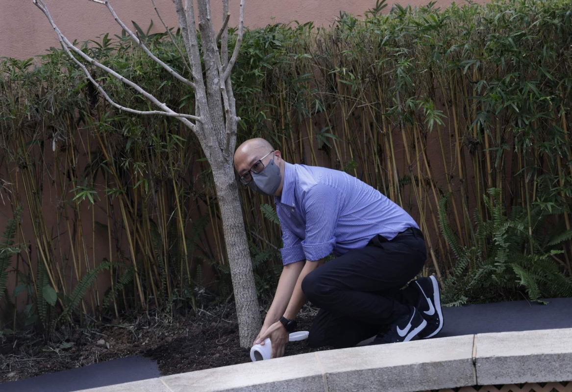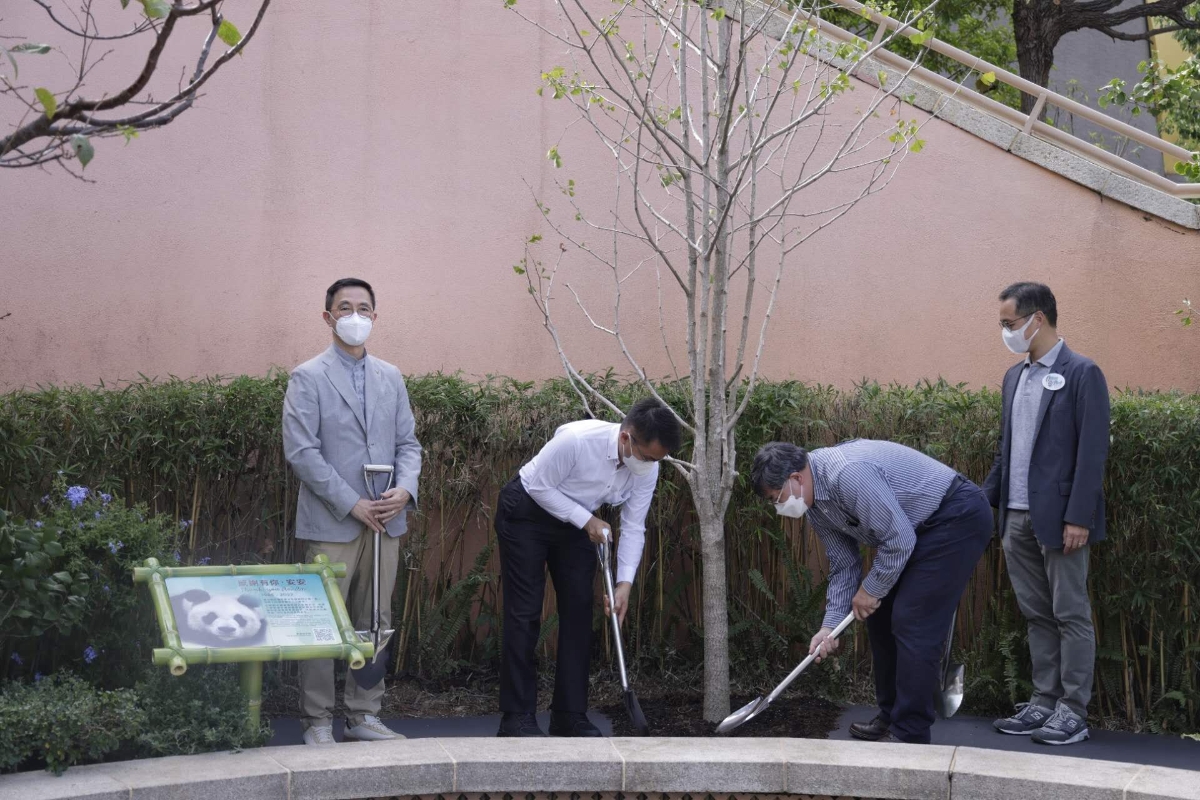 香港文化體育及旅遊局局長楊潤雄(左)、香港海洋公園公司主席龐建貽(右)等人將安安經處理之骨灰埋放在一顆新種植的銀杏樹下。