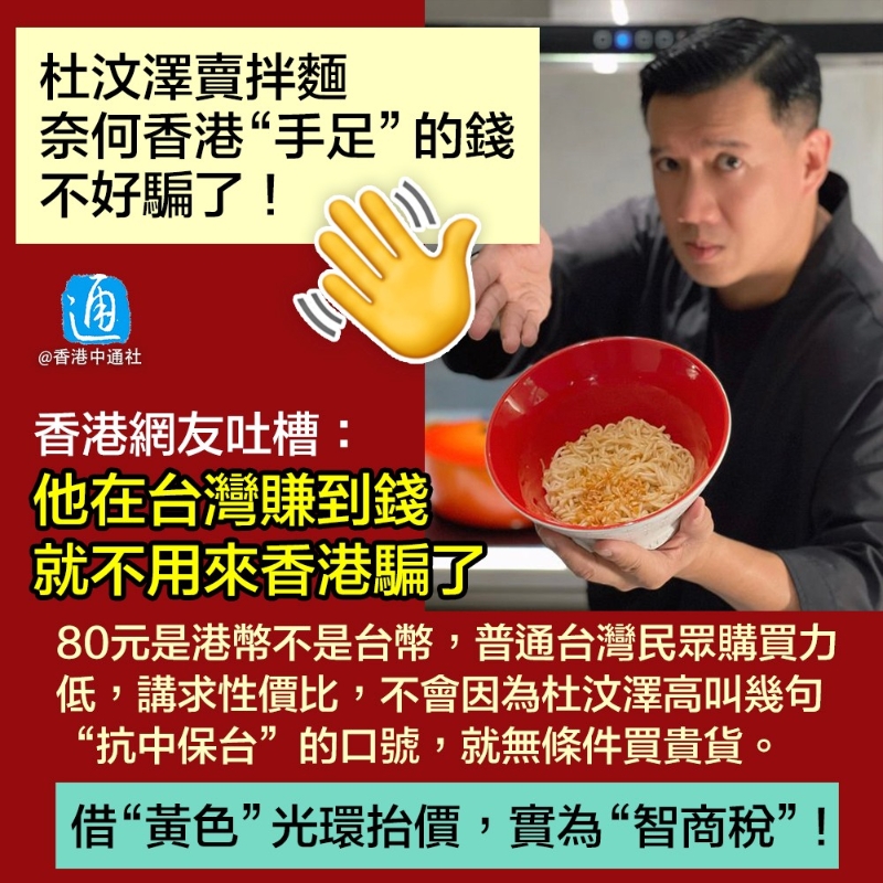 香港新聞網9月30日電 “黃絲”藝人杜汶澤自離港赴台後,又搞網台,又造女團,更“進軍”食品界,但就被指樣樣離不開“手足”課金。最近,他販賣的一款拌麵又被香港網友吐槽借“黃色”光環抬價,實為“智商稅”!