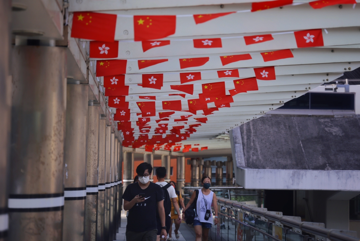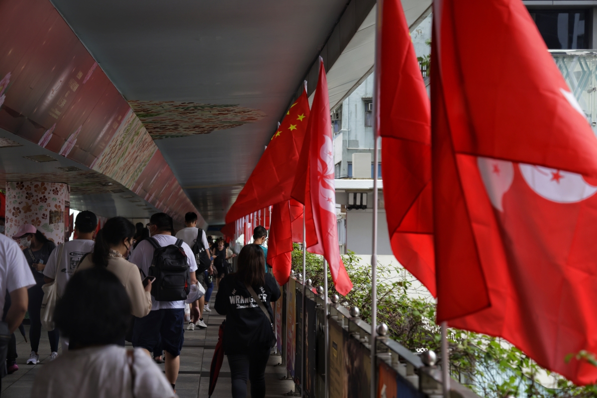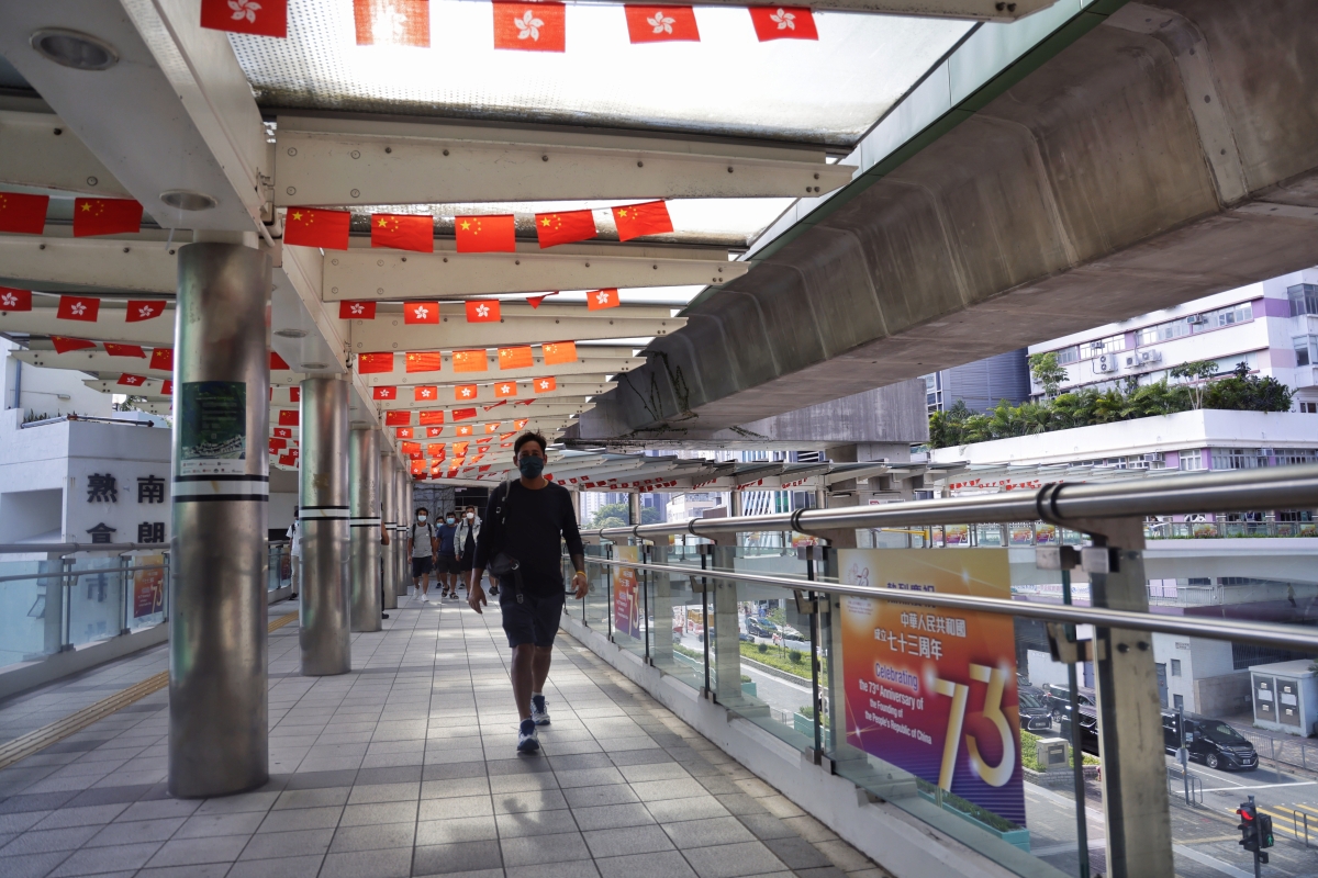 灣仔行人天橋上,紅旗隨風搖動。