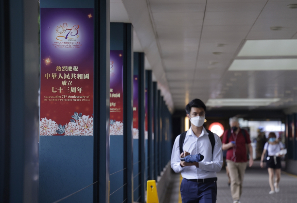 香港新聞網9月30日電(記者 曹文毓)國慶將至,香港大街小巷熱鬧非凡。城市中,各區遍佈紅旗、彩旗、橫幅、標語,以中國紅為主色調的同時,亦有色彩斑斕的裝飾相襯,熱烈慶祝中華人民共和國成立73周年。行走街頭,滿眼“中國紅”,不少市民爭相打卡,氣氛一片祥和。