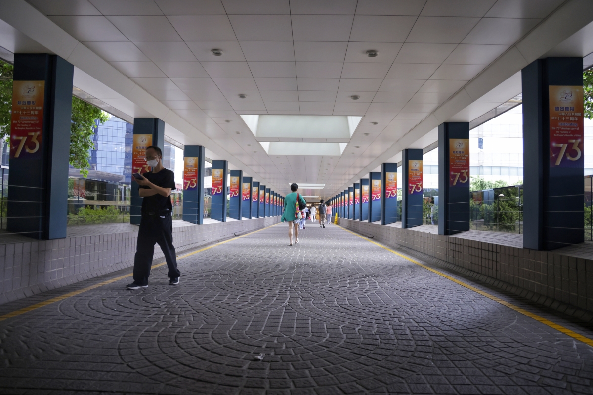 黃竹坑行人天橋紅旗飄飄。