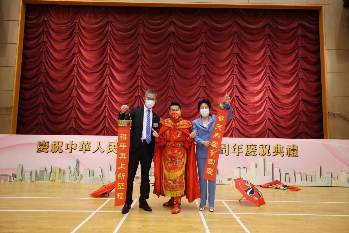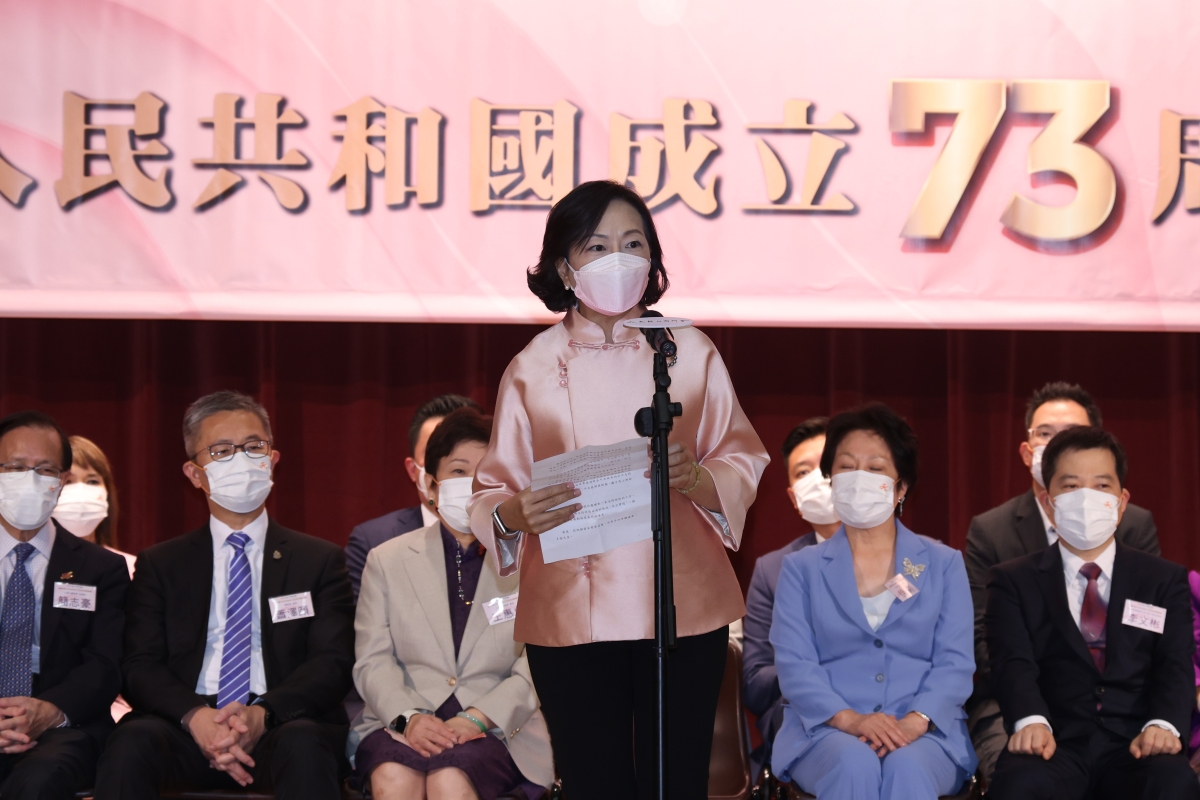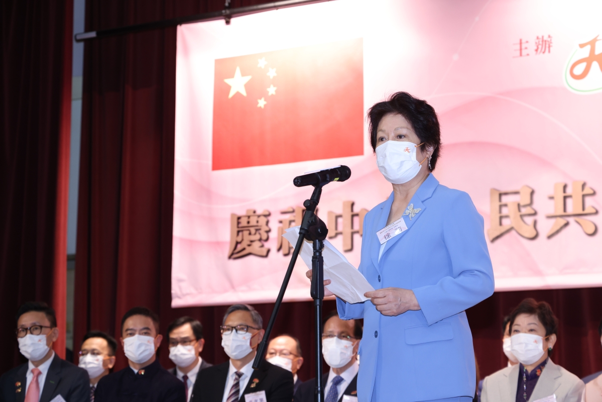 民政及青年事務局麥美娟局長致辭時表示,國家73年來跨越重重考驗,今日無論在經濟、社會、科技、體育、文化等多個領域取得輝煌的成就,作為中華兒女倍感自豪。她續稱今年是香港回歸祖國25年,在國家的鼎力支持下砥礪前行“一國兩制”得以成功實踐,令香港社會繼續繁榮穩定發展。她表示國家主席在七一重要講話勉勵我們要“全面準確貫徹一國兩制方針”,亦相信在中央政府全力支持和香港市民的共同努力下,香港必定會再創新征程。最後她感謝龍聯一直以來支持地區工作,與九龍五區民政事務處緊密合作,期望龍聯繼續支持特區政府施政,充分實踐“一國兩制”,為香港創造更美好的未來。