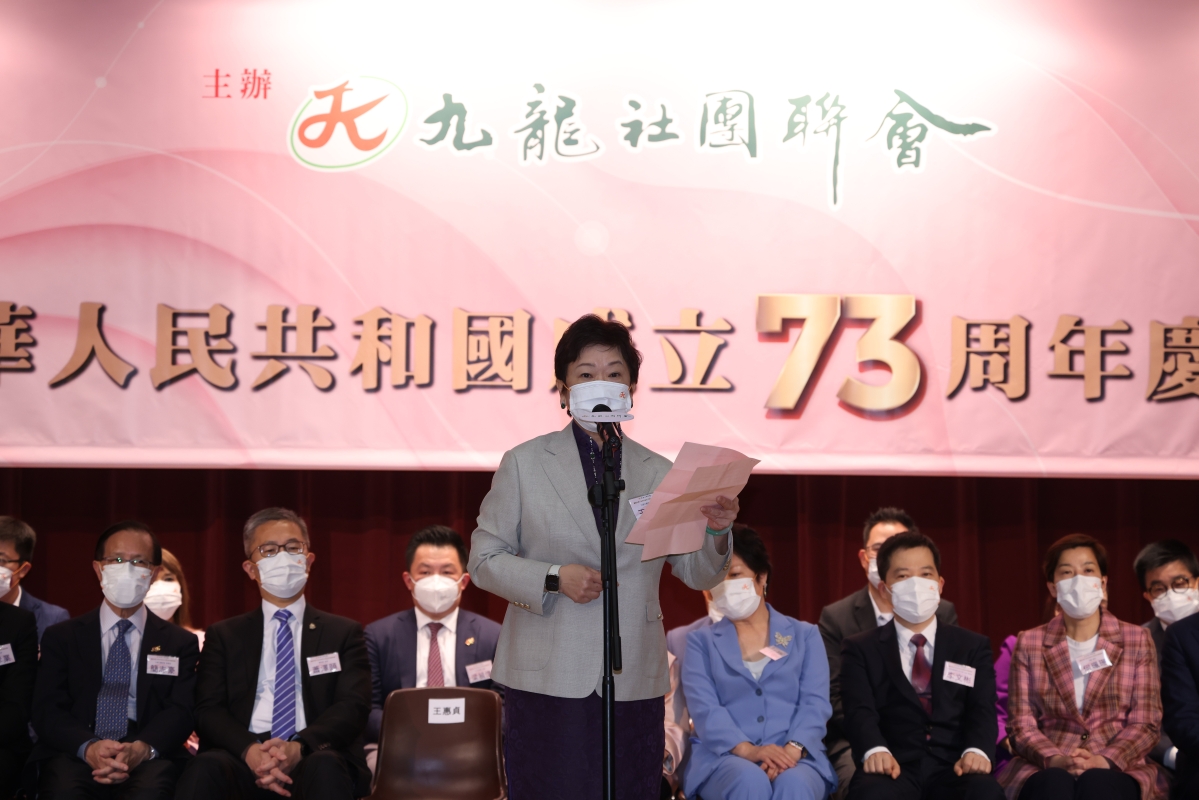 九龍社團聯會王惠貞會長致謝辭時表示,今年是中華人民共和國成立 73 周年,亦是香港回歸祖國25周年。香港回歸祖國,開啟了香港歷史新紀元。中華民族偉大復興進入不可逆轉的歷史進程,香港前途和國家命運血脈相連,息息相關。在新階段,香港要繼續發揮獨特地位和優勢,積極融入國家發展大局,發揮好連接祖國內地同世界各地的重要橋樑和視窗作用。為此,九龍社團聯會於9月29日向李家超特首遞交了《施政報告》建議書,建議更好地發揮地區團體作為官民橋樑的作用,在完善地區治理體系、增強治理效能,排解民生憂難、維護社區和諧穩定等方面,為特區政府提供全方位支持。