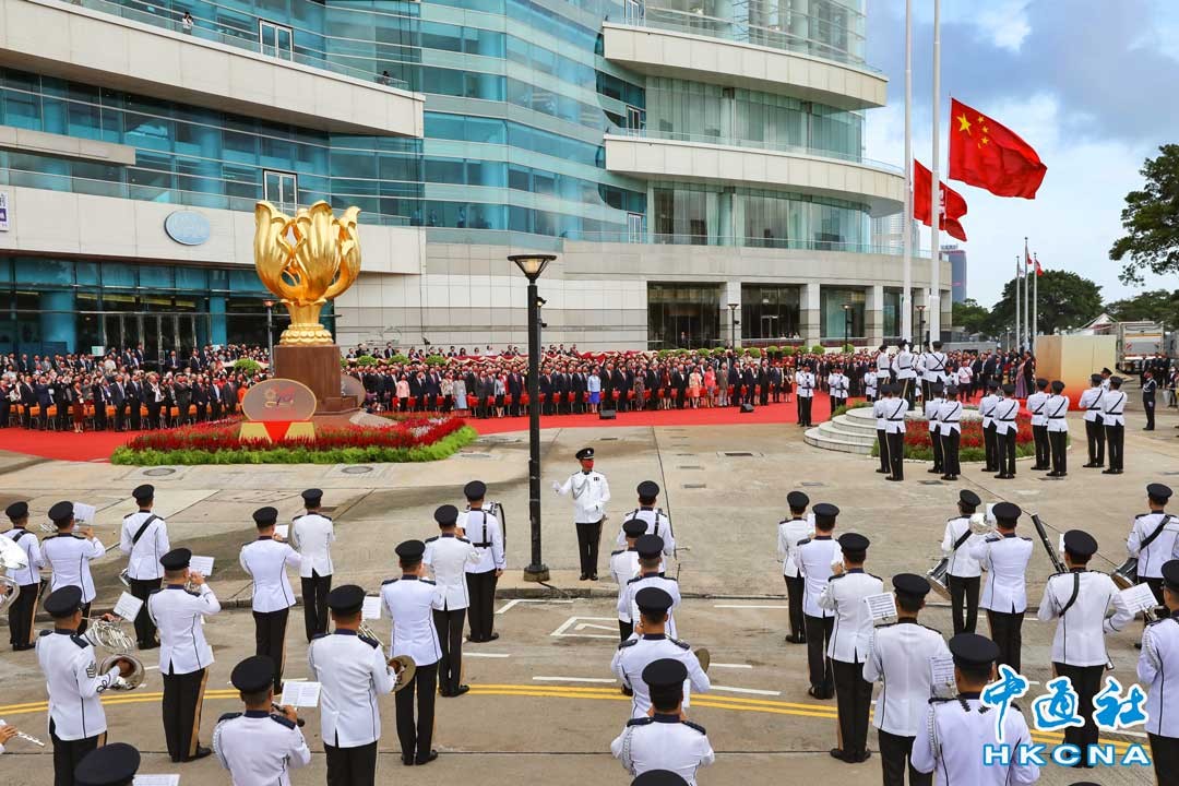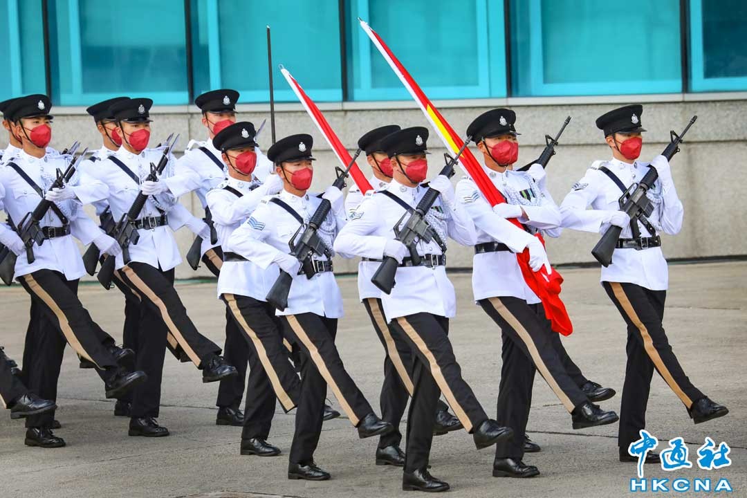 10月1日早上,香港特區政府於金紫荊廣場舉行隆重的升旗儀式,熱烈慶祝中華人民共和國成立73周年。圖為護旗方隊入場。(香港中通社記者 謝光磊攝)