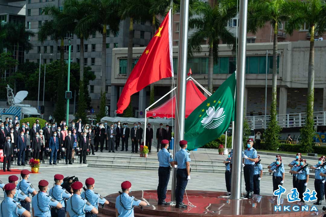 10月1日,為慶祝中華人民共和國成立73周年,澳門特區政府上午8時於金蓮花廣場舉行升旗儀式。澳門行政長官賀一誠偕夫人鄭素貞,澳門中聯辦主任鄭新聰、外交部駐澳特派員公署特派員劉顯法、駐澳門部隊政治委員孫文舉、立法會主席高開賢、終審法院院長岑浩輝,特區主要官員,以及全國人大代表、全國政協委員、立法會議員、行政會委員、社團代表等嘉賓出席。(香港中通社記者攝)