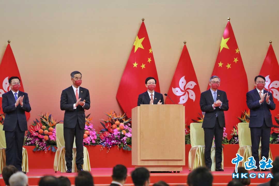 為慶祝中華人民共和國成立73周年,香港特區政府10月1日上午在香港會議展覽中心舉行國慶酒會,李家超首次以香港特區行政長官身份主禮。圖為全體嘉賓起立鼓掌,一起祝福祖國繁榮昌盛。(香港中通社記者 謝光磊攝)