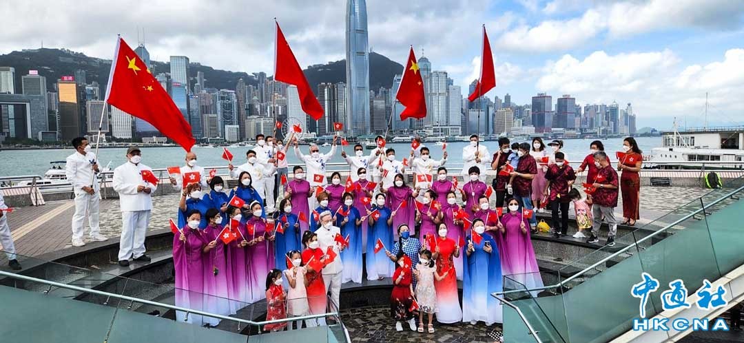 10月1日,香港市民在尖沙咀碼頭發起快閃活動,慶祝中華人民共和國成立73周年。現場見到“國風”陣陣,不少市民身穿漢服、旗袍等中國傳統服飾,共同為祖國送上祝福。(香港中通社記者 曹文毓攝)