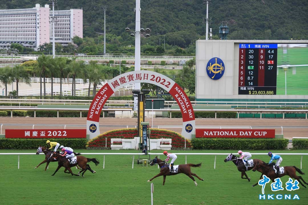 為慶祝中華人民共和國成立73周年,香港賽馬會10月1日舉行國慶賽馬日。當日,大批市民前往沙田馬場觀看賽馬,慶祝國慶。(香港中通社記者 許其皓攝)