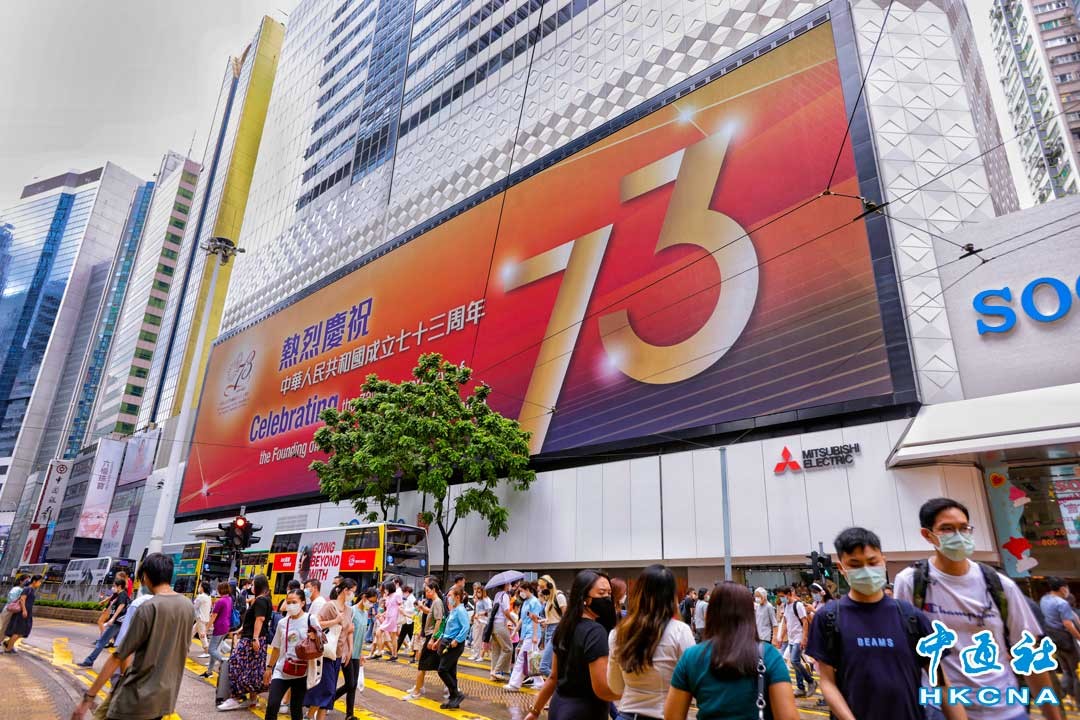 10月1日國慶節,香港銅鑼灣SOGO大屏輪播“熱烈慶祝中華人民共和國成立73周年”、“祖國富強、香港繁榮”等廣告,與市民共賀國慶。(香港中通社記者 曹文毓攝)