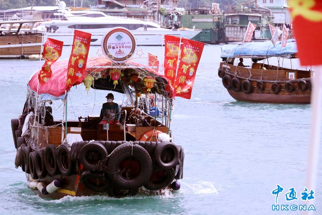 10月1日,中華人民共和國成立73周年國慶之際,香港南區香港仔避風塘,彩旗飛揚。大量船隻插上國旗、區旗,一片中國紅。(香港中通社記者 曹文毓攝)