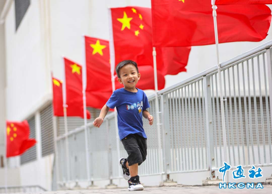 10月1日國慶節,香港深水埗旗海飛揚,喜氣洋洋。圖為小朋友在國旗下玩樂。 (香港中通社記者 徐文峰攝)