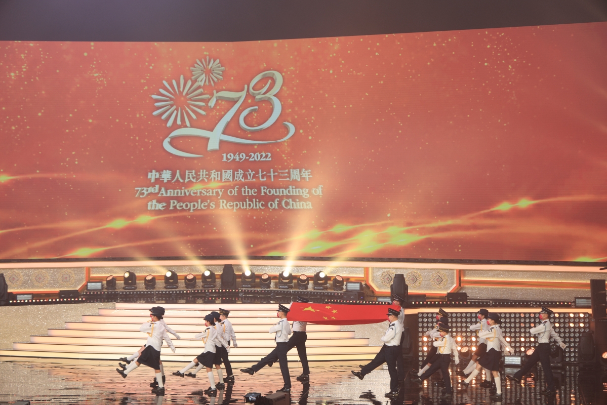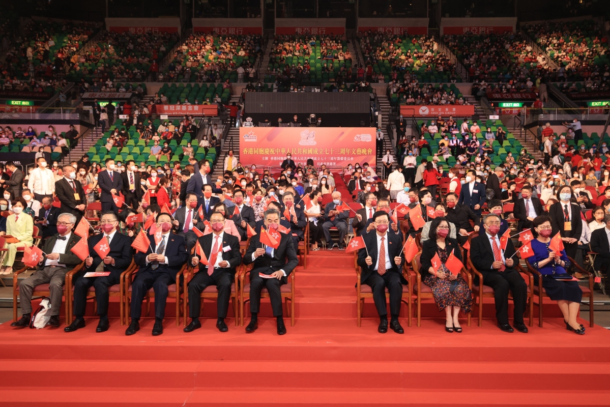 香港新聞網10月1日電(記者 許其皓)“香港同胞慶祝中華人民共和國成立七十三周年文藝晚會”,10月1日於香港體育館舉行。今年晚會主題為“盛世騰飛 璀璨未來”,透過一系列精彩及多元化表演節目與市民慶賀國慶,匯聚了音樂劇、舞蹈、武術、粵劇、音樂演奏等各種表演形式,在展示國家偉績的同時,亦突顯香港在國際體壇、文化藝術方面的成就。 全國政協副主席梁振英、香港特區行政長官李家超、香港中聯辦副主任尹宗華、國安公署副署長李江舟等嘉賓出席晚會。