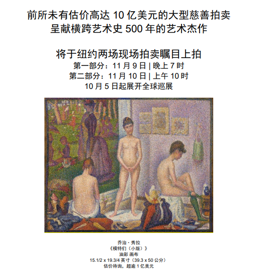 保羅·艾倫為高瞻遠矚的創新之士,致力收藏頂級的藝術珍品和傳奇大師的力作。拍賣呈獻的傑作精彩紛呈,往往為私人珍藏中的臻極之作,包括小揚·勃魯蓋爾(Jan Brueghel the Younger)、威廉·透納(J.M.W. Turner)、愛德華·馬奈(Edouard Manet)、文森特·梵高(Vincent Van Gogh)、喬治·秀拉(Georges Seurat)、保羅·高更(Paul Gauguin)、克勞德·莫奈(Claude Monet)、古斯塔夫·克林姆特(Gustav Klimt)、喬治亞·歐姬芙(Georgia O'Keeffe)、弗朗西斯·培根(Francis Bacon)和盧西安·弗洛伊德(Lucian Freud)等藝術家的傑作。這個珍藏見證藝術先鋒透過運用顔料、光線、肖像技法和不同空間,創作開創性的前衛作品。 二十及二十一世紀藝術美洲區副主席Max Carter表示,就像塞尚(Cezanne)筆下令人嘆為觀止的聖維克多山,保羅·艾倫珍藏也是登峰造極。從勃魯蓋爾的《五感》、透納和馬奈對威尼斯的想象,以至梵高、高更和莫奈的十九世紀末傑作,還有克林姆特的《白樺林》,以及佛洛伊德的《大室內場景 W11 (隨華托)》,堪稱過去50年中最傑出的室內作品。這個珍藏體現無匹創見和卓越質量。另外還有秀拉的《模特們》,此作曾先後由阿爾馮斯·韓肯(Alphonse Kann)、約翰·奎因(John Quinn)和亨利·麥克赫尼(Henry McIlhenny)收藏,並於 1913年的軍械庫展覽會上展出,畫作於 1970 年首次亦是唯一一次亮相拍場,當時藝術史學家約翰·羅素(John Russell)認為這是自世界大戰以來拍賣史上所見最優美動人的三、四件藝術品之一,魅力至今絲毫未減。 佳士得美洲區主席Marc Porter認為,這是一個前所未有的時刻,藏家的慧眼和他欣賞的藝術家傑作都名符其實。“先鋒創見:保羅·艾倫珍藏”雲集大批藝術巨作,以歷史前所未見的規模支持善舉。很難想象單憑一人的熱忱能建立如此出類拔萃的珍藏,但艾倫的確是極富遠見的先鋒,懂得欣賞同樣以全新角度審視世界和以嶄新方式加以解說的藝術家。佳士得有幸能呈獻這場歷史性拍賣,並與全世界分享這批難得一見的佳作,深感欣慰自豪。 (完) 【編輯:崔靜雯】