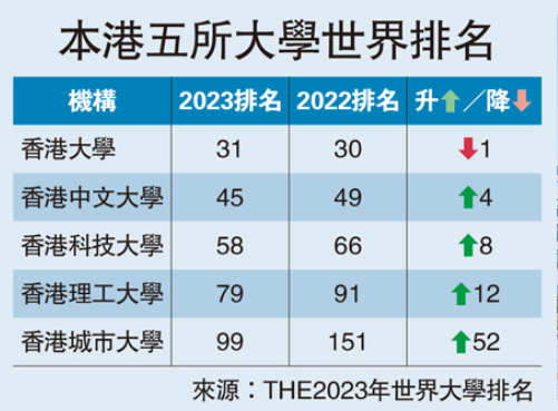 中大整體評分達73.2分,位列國際院校前茅,其中教學、研究、引文及國際展望範疇的評分均排名全球前一百名。“發表的論文數量”及“研究收入”兩項績效指標的評分更達滿分﹔“大學總收入”及“國際員工比例”的評分亦達99.9分﹔“教學聲譽”及“研究聲譽”的評分則較去年明顯上昇,成績理想。 中大校長段崇智教授表示,是次THE世界大學排名結果反映了中大成員的卓越才能、不懈努力和遠見卓識。《中大策略計劃2021-2025》以研究與創新、拓展全球視野、人才吸納與培育為重點發展目標,實現“力臻卓越,任重志遠”的使命。 他續指,是次佳績再次顯示了我們對追求卓越的堅持,在香港發展成知識型經濟,積極融合國家發展大局的關鍵時刻,各本地大學已準備就緒,助力香港成為中國與世界的超級樞紐。中大在國際公認排名榜的佳績是信心的認證,大學將繼續發揮所長,肩負重任,邁步向前。 2023年THE世界大學排名涵蓋來自104個國家或地區共1799所大學,根據教學(學習環境)、研究(數量、收入和聲譽)、引文(研究影響力)、國際展望(員工、學生及研究)及行業收入(知識轉移)五個範疇,共13項績效指標評分。(完) 【編輯:張明臻】