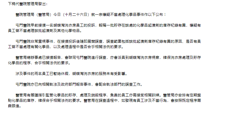 醫管局總辦事處已接獲報告,會聯同屯門醫院進行調查,亦會派員到蝴蝶灣洗衣房視察,確保洗衣房處理及貯存化學品的程序,合乎相關法例的要求。涉及事件的兩名員工已暫時休假,蝴蝶灣洗衣房的服務未有受影響。屯門醫院亦已向相關執法及政府部門報告事件,會配合執法部門的調查工作。 醫管局稱,有嚴謹指引監管化學品的貯存、處理及銷毀程序,負責的員工亦需接受相關訓練。醫管局亦安排有定期盤點化學品的庫存,確保合乎相關法例的要求。醫管局在調查過程中,如發現有員工涉及不當行為,會按照既定程序嚴肅跟進。 【編輯:刘春】