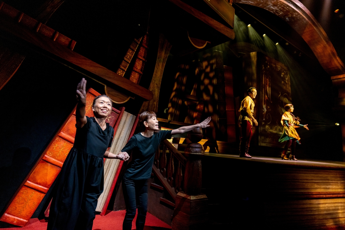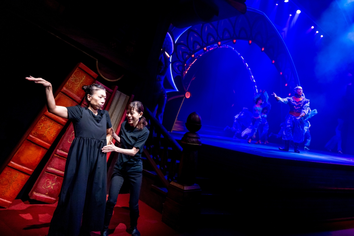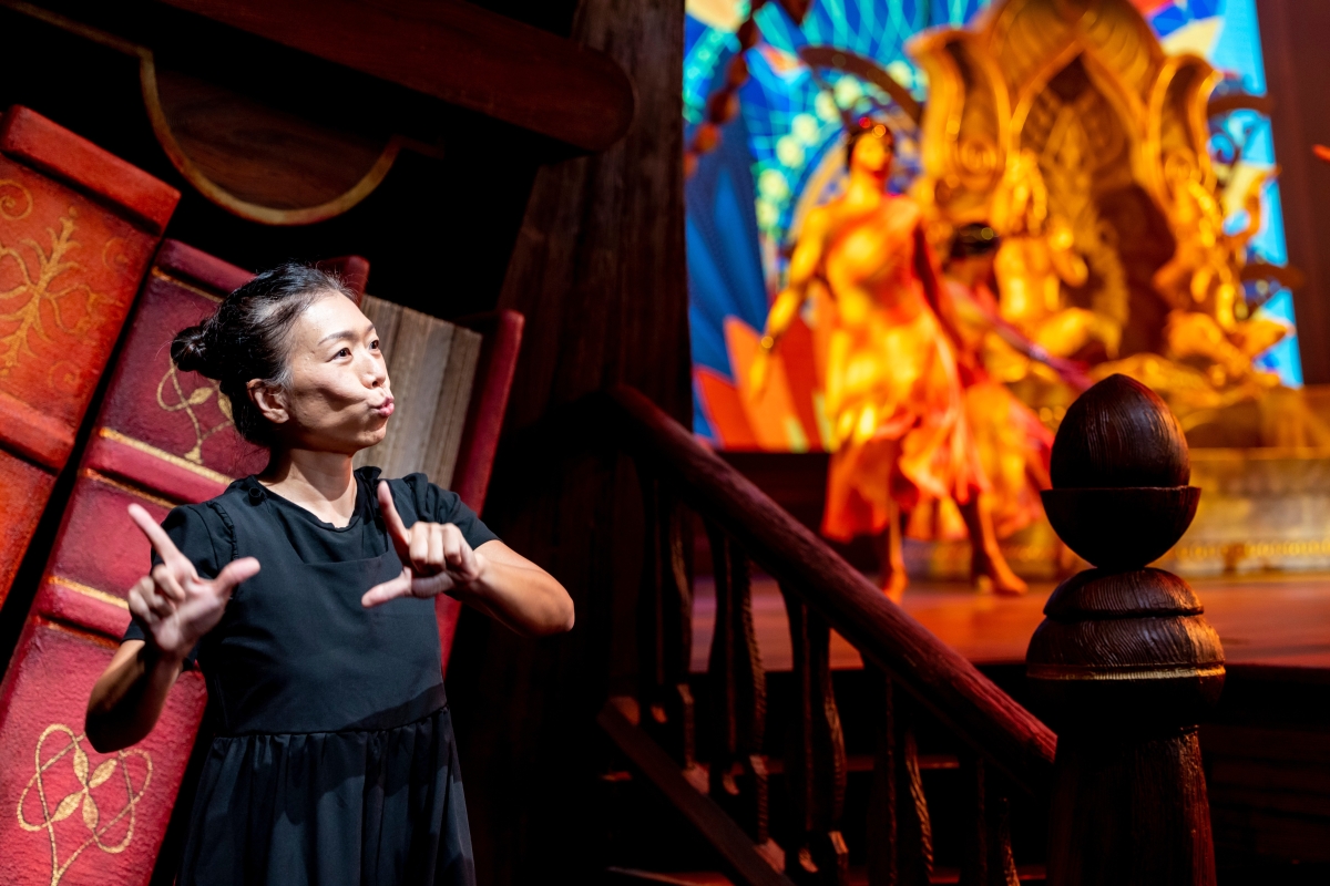 香港中通社圖片 “迪士尼魔法書房”這套約30分鐘的音樂劇,雲集了多個迪士尼故事和人物。賓客會置身其中,與米奇老鼠、高飛以及來自《冰雪奇緣》、友善可愛的雪人Olaf小白走進魔法書,經歷奇妙旅程。三位迪士尼朋友將於表演中穿梭於七個深受世界各地觀眾歡迎的迪士尼故事,包括:《小泰山》、《小魚仙》、《魔髮奇緣》、《勇敢傳說之幻險森林》、《阿拉丁》、《公主與青蛙》及《魔雪奇緣》。 據介紹,劇場視形傳譯員在7月底開始排練及拍攝錄像;其後在9月份踏上舞台做排練,至11月初正式演出,合共用了大約三個多月時間籌備。劇場視形傳譯有別於一般手語傳譯,前者將手語傳譯提昇至一個藝術表演的層次。兩名劇場視形傳譯員站在舞台一旁,為演藝人員的對白和歌唱進行傳譯,還會加入符合角色身份的身體動作、節奏、面部表情和韻律。 為了更好的傳達劇場的效果,選定劇目及遴選劇場視形傳譯員後,各人便就要著手研究歌曲和劇目內容,以及深入了解角色的人物中心思想、神髓、各種微表情和動作。為了更傳神地為表演傳譯,他們更觀看了多齣迪士尼的動畫和電影,了解每個角色的神態。