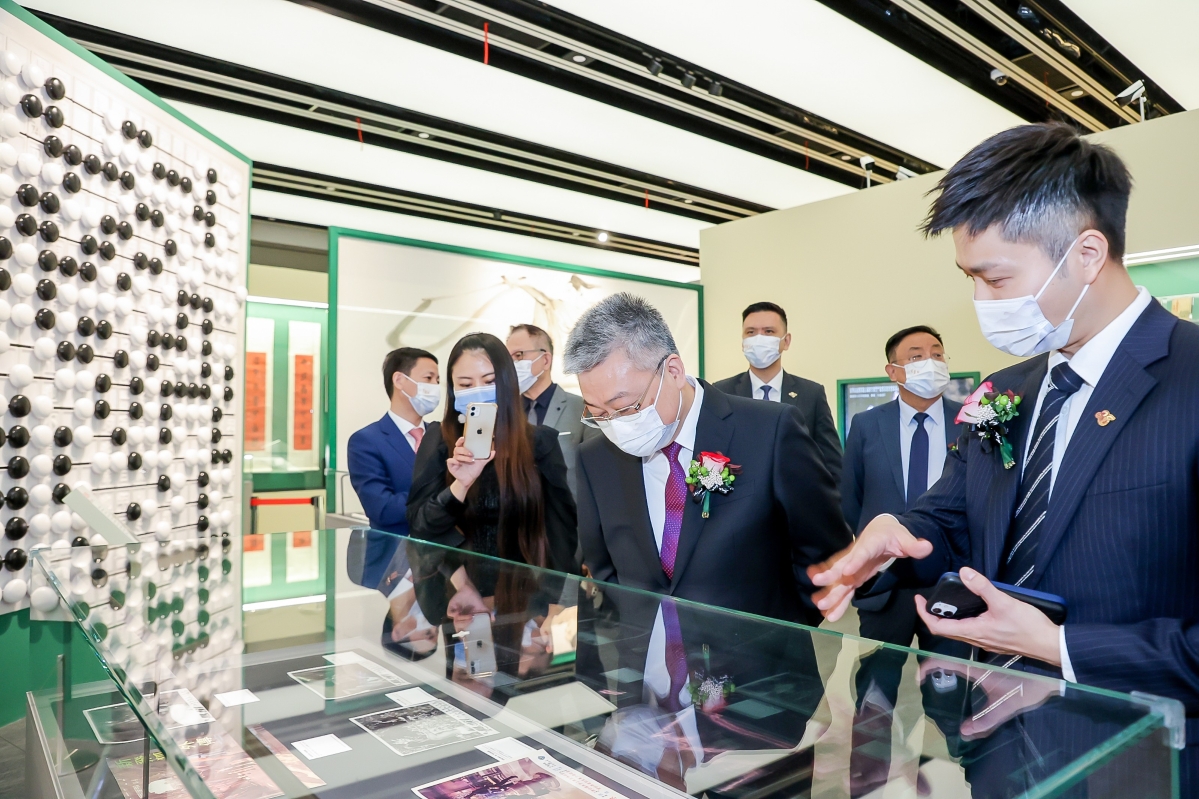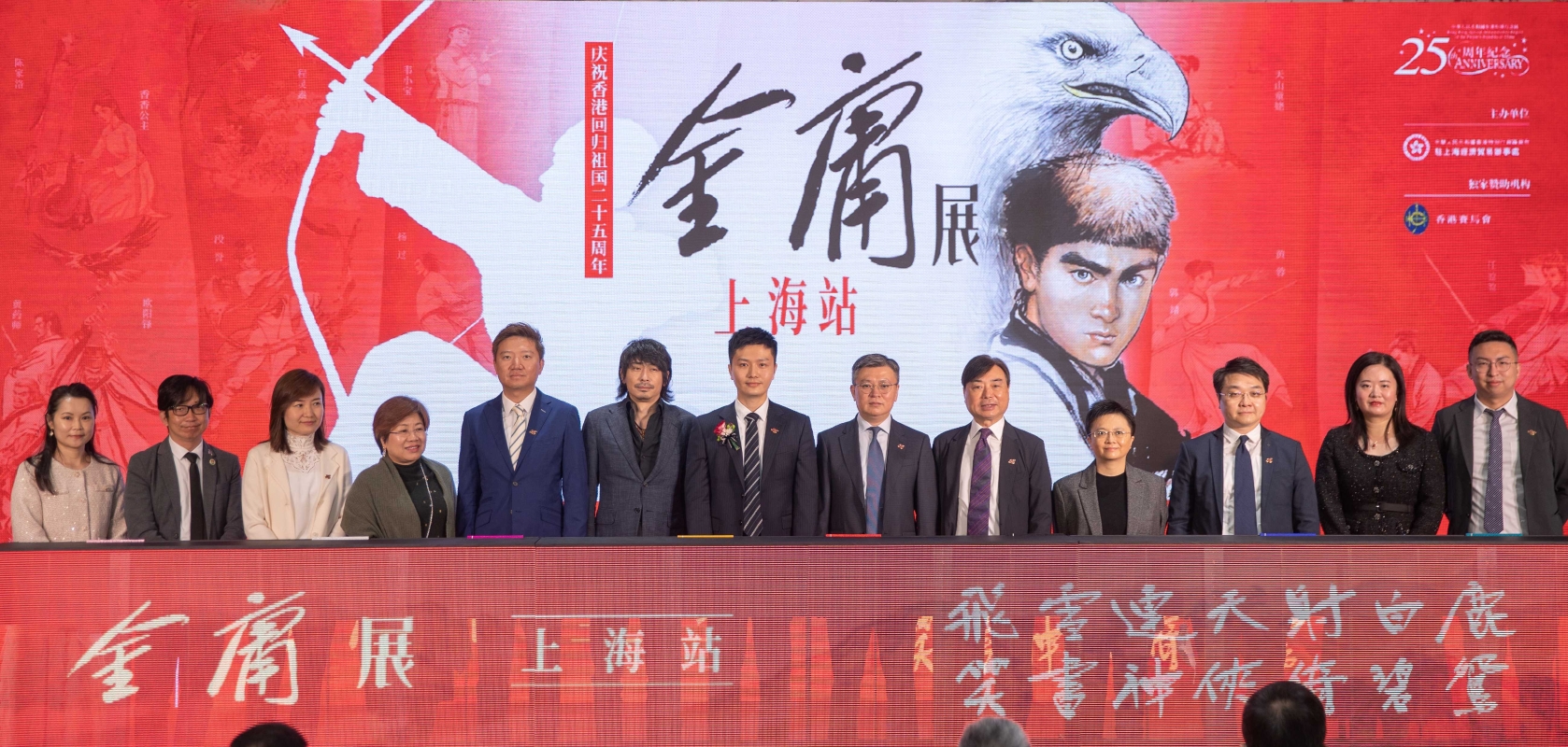 圖源:政府新聞網 勞逸民亦特別感謝查良鏞博士家人對展覽的大力支持和寶貴意見,並同時感謝上海市委及市政府各個單位,包括上海市委宣傳部、上海市人民政府港澳事務辦公室、上海市文化和旅遊局、上海圖書館、康樂及文化事務署(康文署)和明河社出版有限公司在展覽籌備期間的協助。 上海市人民政府港澳事務辦公室主任張小松在開幕典禮上致辭時表示,對香港回歸以來取得的巨大成就表示祝賀。他相信香港在中央的堅強領導下,將進一步發揮獨特地位優勢,更好對接國家發展戰略,積極融入國家發展大局。上海和香港人文相親,經濟相融。滬港合作會議機制自二○○三年建立以來,雙方合作不斷發展,他期待以“金庸展”為契機,加強雙方文化交流合作。 出席開幕典禮的其他主禮嘉賓包括上海圖書館書記樓巍,上海市人民政府港澳事務辦公室副主任周亞軍、上海市文化和旅遊局副局長金雷、上海市政協港澳台僑委員會專職副主任湯立園、上海市委宣傳部二級巡視員周強及上海海外聯誼會總幹事鄒芳。多個在滬港人團體代表及在滬香港學生亦有受邀出席開幕典禮。曾改編拍攝多部金庸作品的著名導演張紀中亦以影片分享他與金庸小說的關係。 “金庸展”由駐滬辦主辦,康文署協辦,規模空前。展廳面積約10000平方呎,展出展品約300件,包括珍貴手稿、報刊、初版小說、影視素材,以及金庸曾用過的文具、印章和棋盤等私人物品,當中大部分皆是首次在內地展出,展示金庸的早期事業、小說創作歷程及其作品對流行文化的影響。為配合展覽,上海圖書館亦借出珍貴館藏包括查良鏞博士祖父查文清的鄉試朱卷及會試朱卷,以及查氏家族的族譜於展覽中展出。展覽亦同時展出多名香港藝術家向金庸致敬的藝術作品,包括查良鏞博士女兒查傳訥、著名畫家李志清和黃玉郎,以及跨界藝術家馬興文的作品。展覽亦設有互動“打卡點”和遊戲,重新呈現了金庸武俠世界的經典場景。