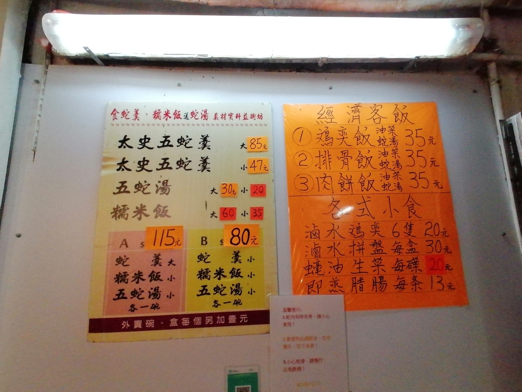 “蛇王娟”餐館手寫餐牌。 【編輯:洪少葵】