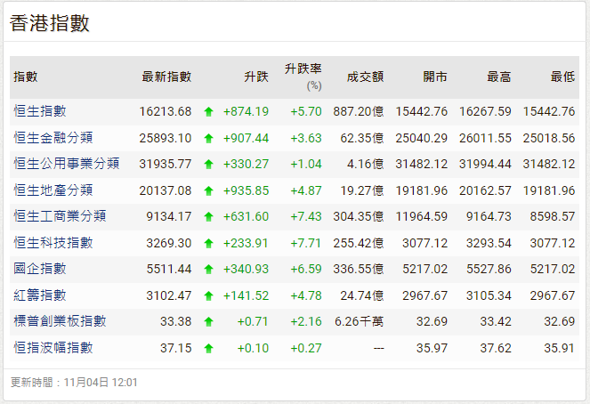 香港新聞網11月4日電  港股半日報復式反彈逾800點,重上16000點及20天綫。恒指4日半日升874點,報16213點,半日成交達887億港元。