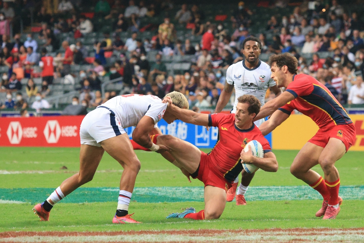 闊別三年,香港國際七人欖球賽4日在萬眾矚目下隆重回歸,包括港隊在內的16支勁旅一連三日在香港大球場驚險對決。球場上隊員圍追堵截,看台上球迷舉杯喝彩,呼聲掀翻全場。