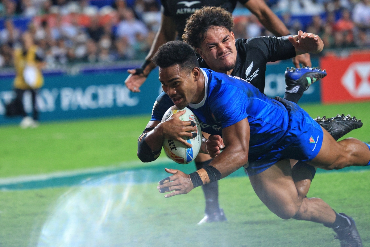 圖為新西蘭隊(黑)對戰薩摩亞隊(藍)。