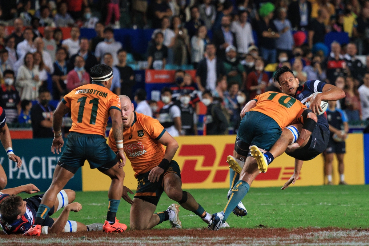 首場小組賽,香港隊(藍)以0:43不敵澳大利亞隊(黃)。港隊幾次搶球、飛撲、達陣前攔截,一度讓比賽十分驚險,市民高呼“香港”。