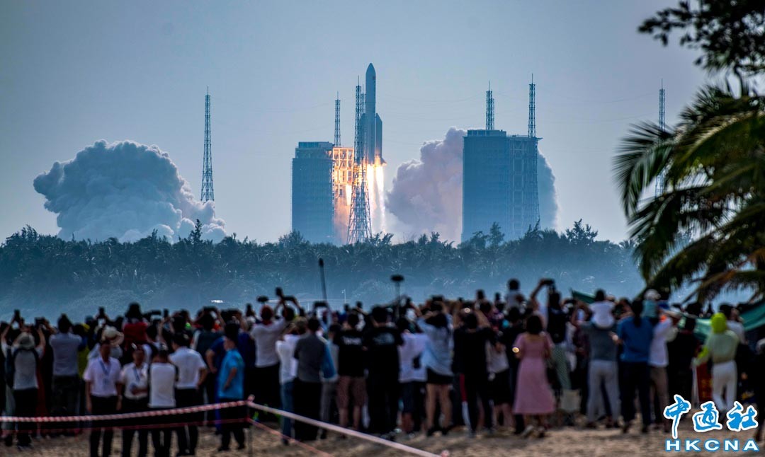 北京時間10月31日15時37分,搭載空間站夢天實驗艙的長征五號B遙四運載火箭,在中國文昌航天發射場准時點火發射,約8分鐘後,夢天實驗艙與火箭成功分離并準確進入預定軌道,發射任務取得圓滿成功。圖為民眾在海南文昌淇水灣沙灘觀看長征五號B遙四運載火箭點火升空。(香港中通社記者攝)