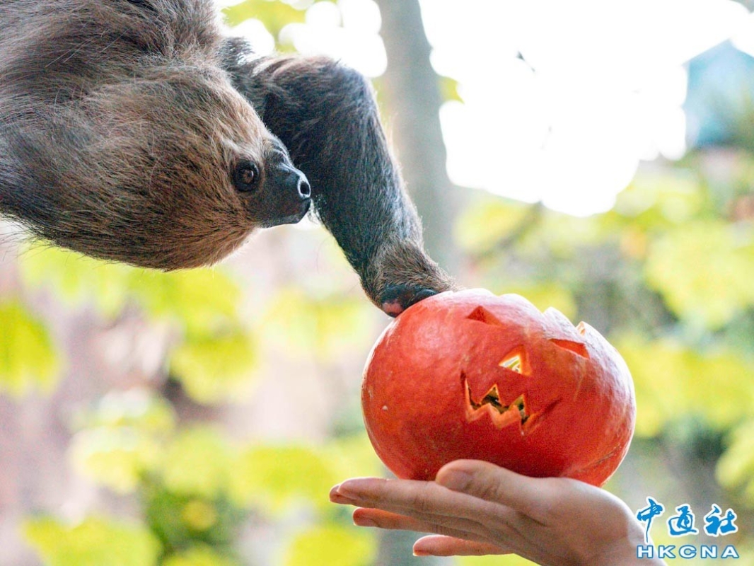 10月31日是萬聖節,台灣台北市動物園特別為動物準備了萬聖節大餐,保育員將象徵萬聖節的"南瓜"挖空,雕刻上各式創意鬼臉,然後放入當季食材,讓動物吃得滋味之餘,也能一同感受萬聖節氣氛。(香港中通社記者攝)