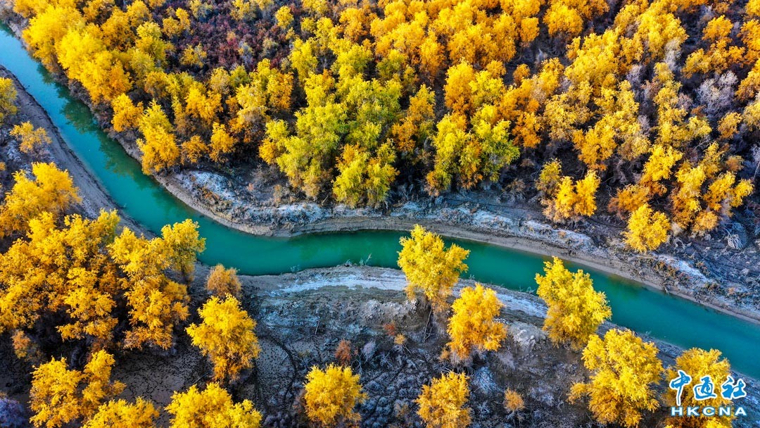 金秋時節,新疆阿克蘇地區沙雅縣470萬畝胡楊林盡染秋色,猶如金色的海洋,如詩如畫,美不勝收。據介紹,塔裡木河流經沙雅縣,蜿蜒盤旋220公里,形成眾多湖泊和水域,為野生胡楊生長提供了良好的生態環境。圖為10月31日,航拍塔裡木河兩岸的胡楊林。(香港中通社記者攝)