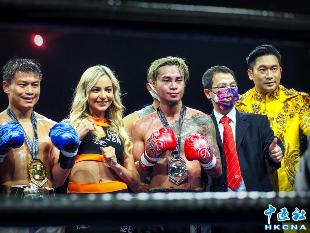 11月1日晚,I-1世界泰拳賽會在九龍灣國際展貿中心舉辦2022年度世界泰拳大匯戰賽事,配對多位拳壇王者與及香港新晉精英拳手對賽。圖為獲獎選手登台亮相。 (香港中通社記者 洪少葵攝)