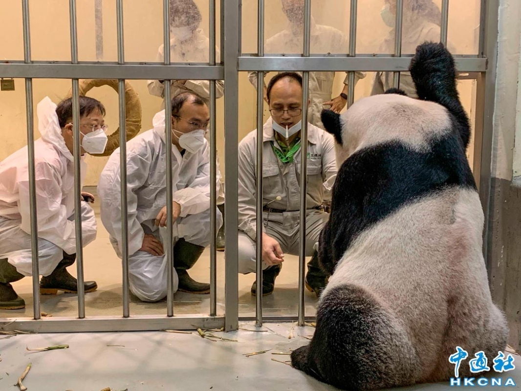 11月2日上午,大陸貓熊保護研究中心的兩位專家,吳虹林(中)及魏明(左)探視患病熊貓“團團”。兩位專家於11月1日晚間抵台,預計11月7日返程,在台期間會與台北市動物園醫療照護團隊,針對熊貓醫療及日常照料進行交流並提供建議。(香港中通社記者攝)