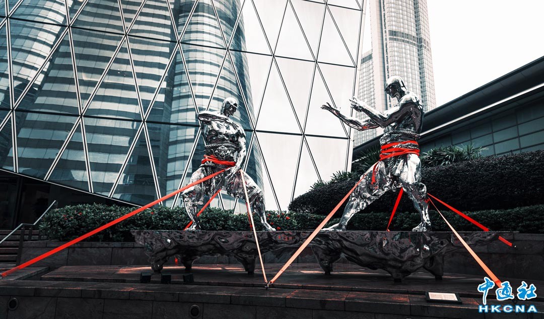 11月2日下午,香港天文台在發出八號西北烈風或暴風信號,交易廣場的雕塑被加固。(香港中通社記者 許其皓攝)