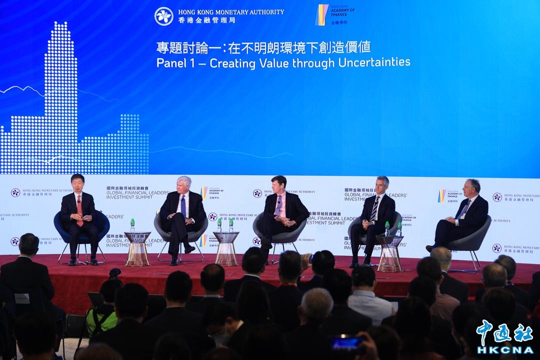 11月3日,香港國際金融領袖投資峰會第三日活動,舉行“與國際投資者對話”研討會。研討會邀請了九家全球頂尖投資管理機構參加兩場專題討論,探討投資前景及投資者如何定位以管理風險及把握未來機遇。圖為“在不明朗環境下創造價值”專題討論。(香港中通社記者 許其皓攝)