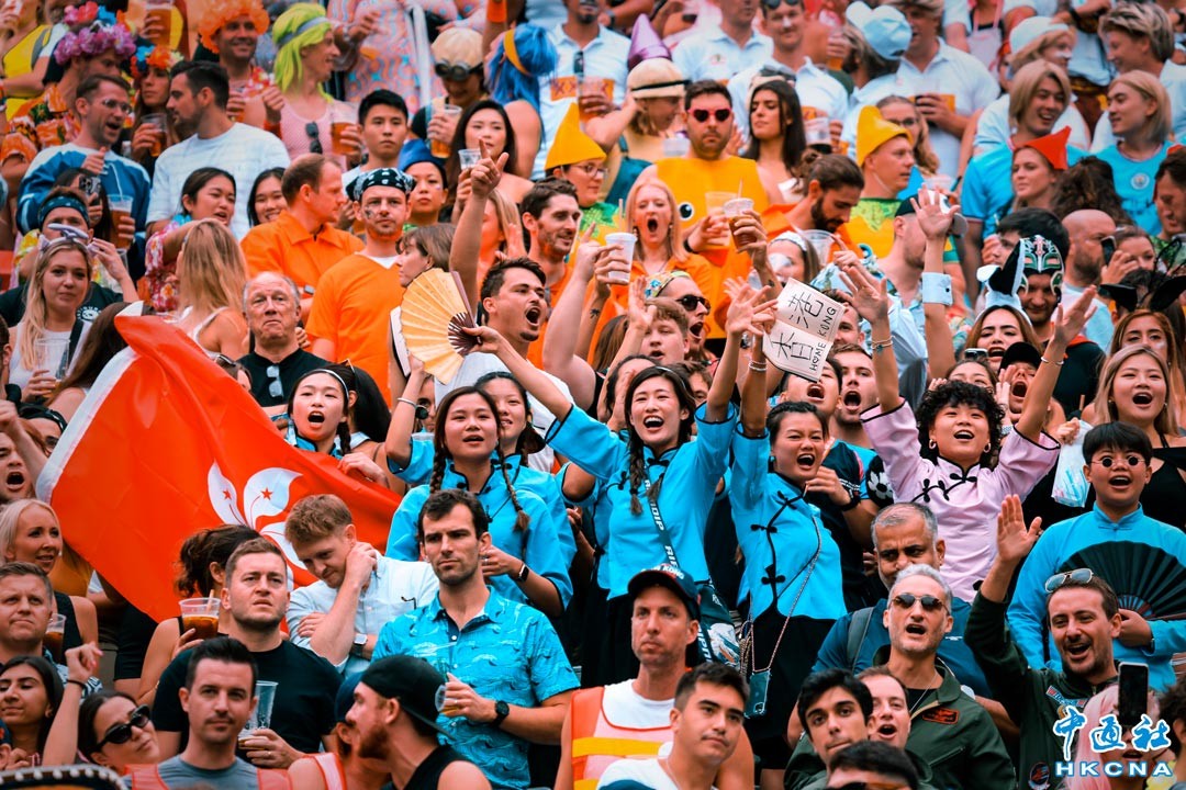 11月5日,香港國際七人欖球賽舉行第二個比賽日,正值周末,現場熱鬧非凡,觀眾席人山人海,大批球迷入場看球狂歡。(香港中通社記者 許其皓攝)