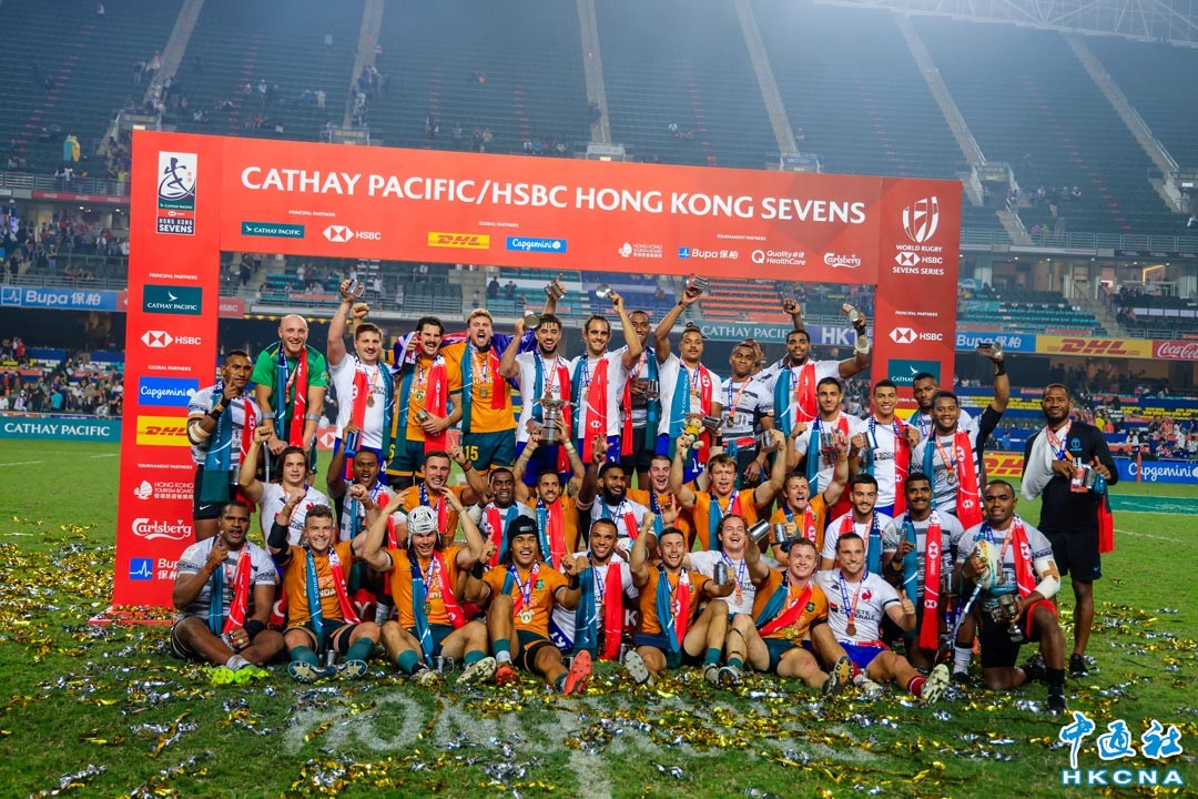 11月6日,香港國際七人欖球賽舉行總決賽,澳大利亞隊以20:17戰勝斐濟隊贏得總冠軍。圖為澳大利亞隊員在贏得比賽後捧起獎杯慶祝。(香港中通社記者 許其皓攝)