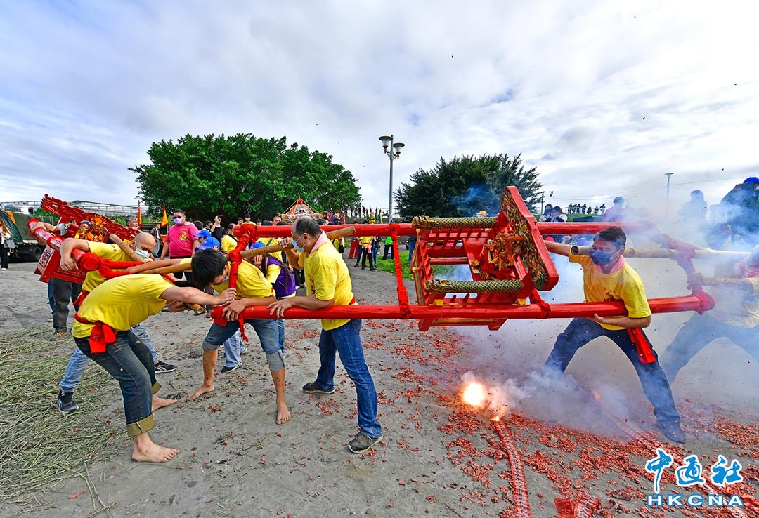 台灣新北市三重區先天宮11月6日舉行五年一科的王船祭,王船出廠後停放廟前供善男信女祭拜。重頭戲“送王船”出發繞境到蘆洲橋河邊,並在熊熊烈火中燒化,希望能藉此將疫情送走,祈求百姓平安。(香港中通社記者攝)