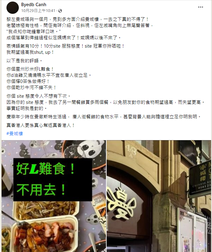 香港新聞網11月7日電 移英後,香港“同路人”鬧翻了? 近日,有移英港人在社交媒體發文鬧爆英國曼徹斯特的一家知名“黃店”,稱其食物質素和服務態度均令人不敢恭維! 該移英港人自述移英不足一月,看到很多帖子均推薦在英“黃店”“曼城樓”,於是滿心期待前去幫襯。未料到該店老闆娘“極有性格”,問她有什麼推薦菜式,她只是“斜視”了一眼,向上歪了歪嘴角,不耐煩地說了句“我怎麼知道你們喜歡什麼口味”。該網友直指,從下單到結賬的整個過程,老闆娘的態度都非常之差。