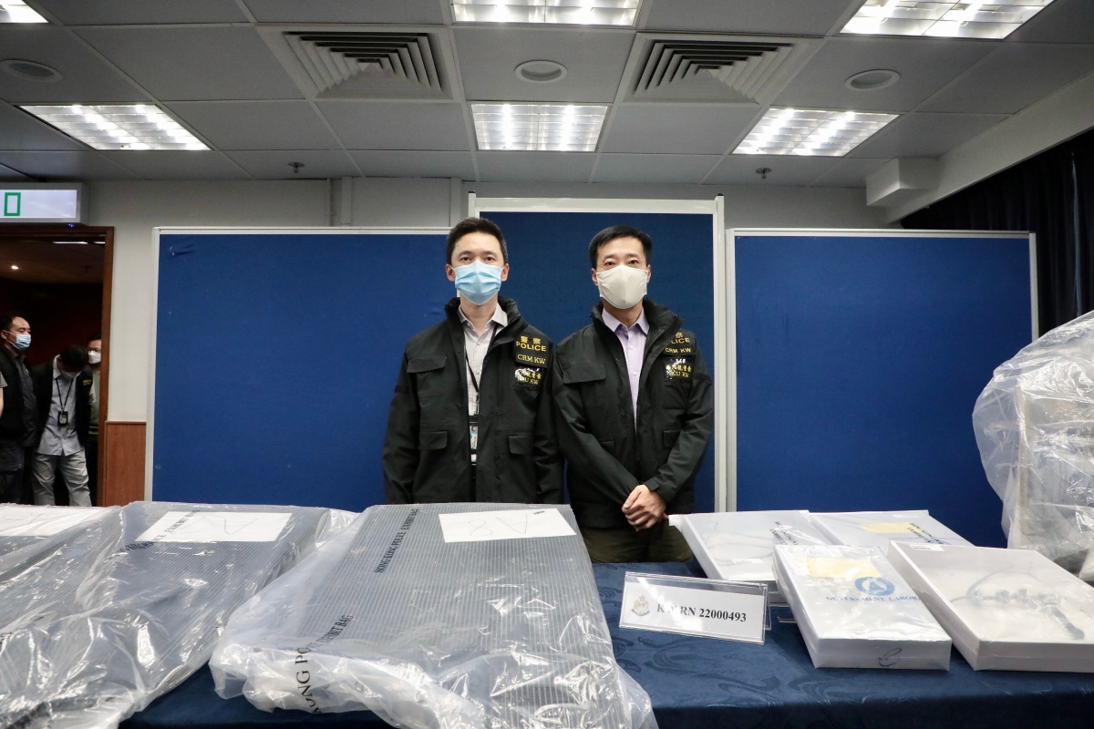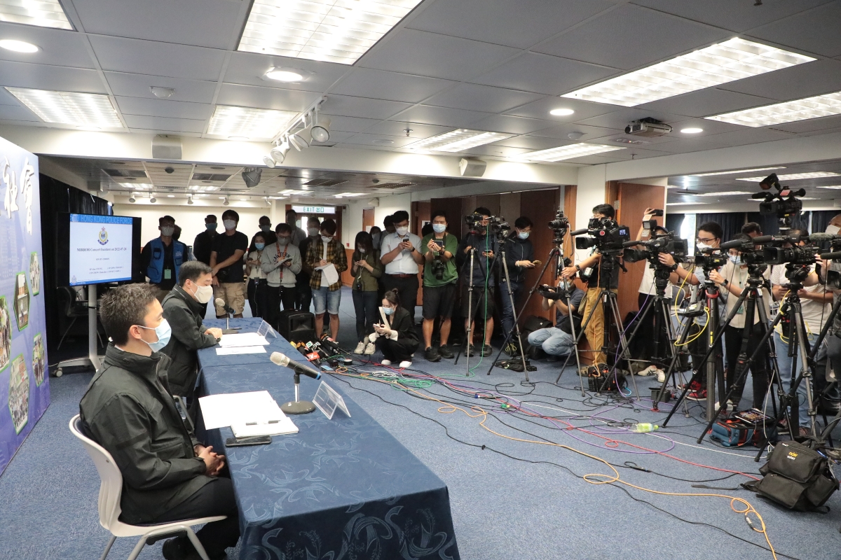 香港西九龍重案組第4隊總督察周振才、西九龍總區刑事部(行動)警司鍾雅倫在西九龍總區警察總部召開記者會。