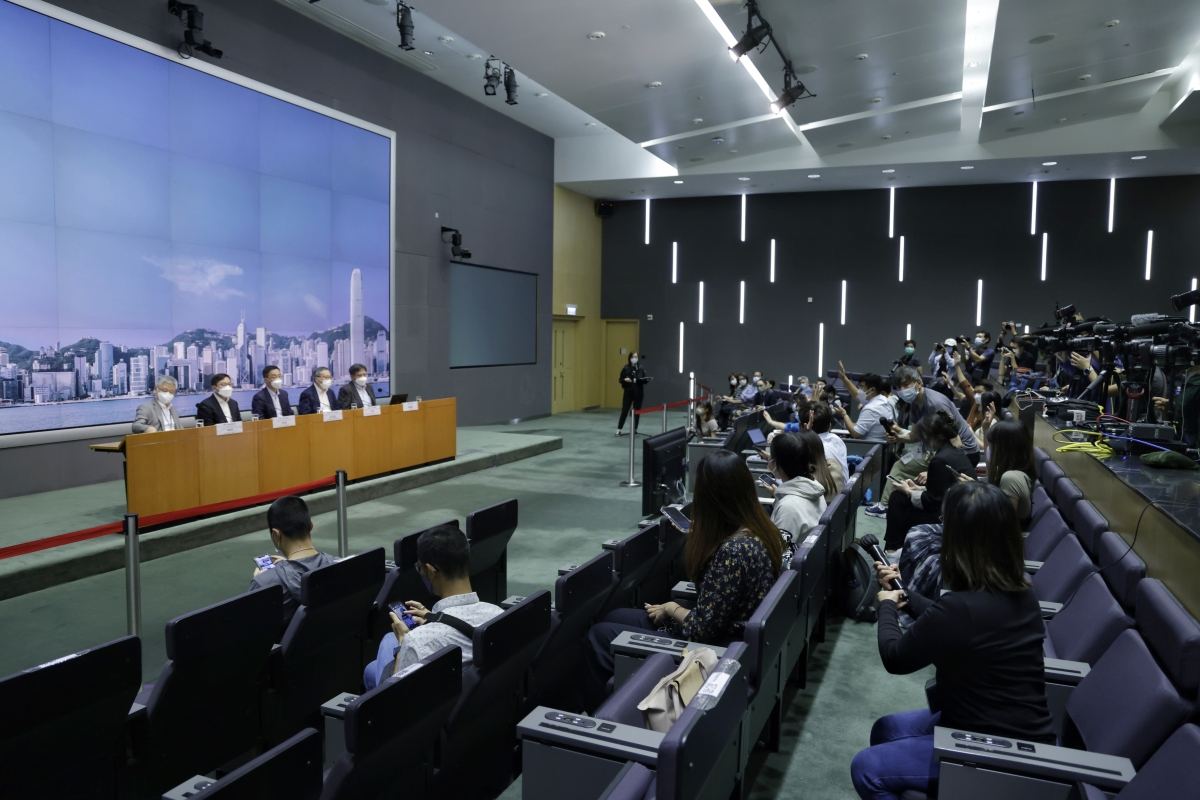 勞工處助理處長(職業安全)陳家禮(左起)、勞工及福利局局長孫玉菡、文化體育及旅遊局局長楊潤雄、調查Mirror演唱會事故工作小組主席李子俊和專家顧問林超雄出席記者會