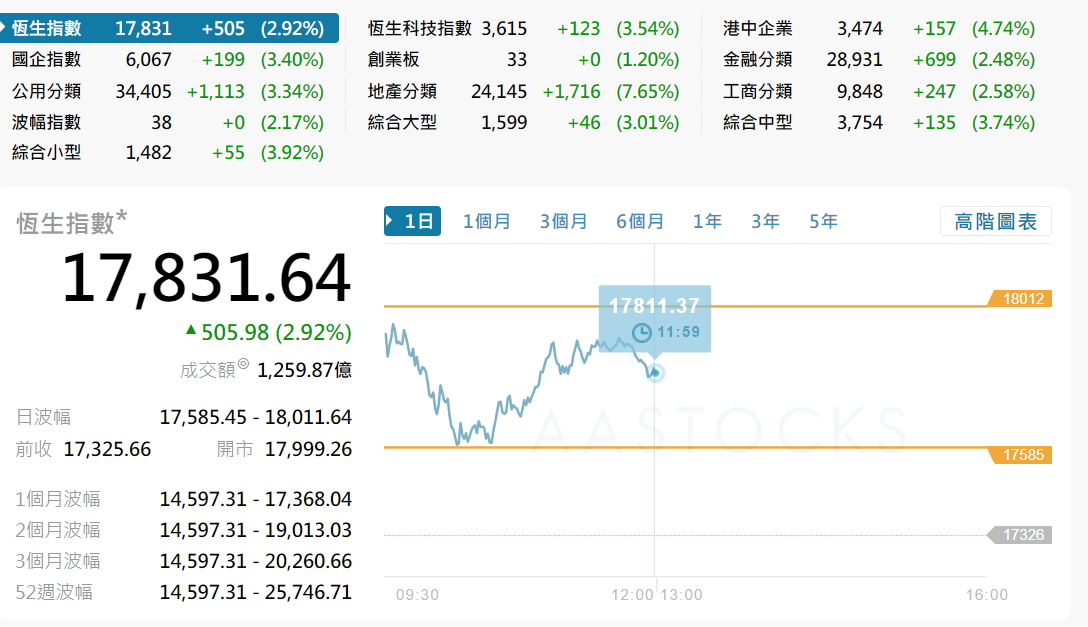 香港新聞網11月14日電 恒生指數14日中午收市報17831點,升505點或2.9%。半天成交額為1259.8億港元。