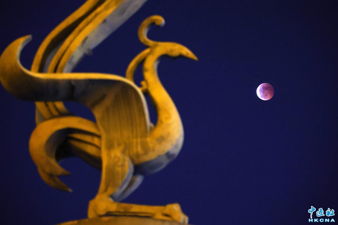 11月8日晚,江蘇南京,一場月全食出現在夜空。圖為月全食“生光”階段,地球的陰影開始移出月面。(香港中通社圖片)
