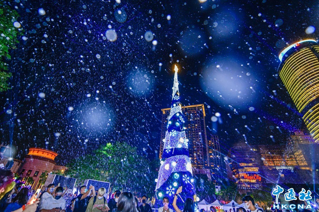 台灣新北市歡樂耶誕城活動11月11日晚上舉行點燈開幕,現場光雕秀吸引民眾駐足。新北歡樂耶誕城是台北最大的耶誕派對活動,今年的主題與亮點,除了集結迪士尼、皮克斯、漫威、星際大戰等銀白北國裝飾,整個派對將化身銀色雪白之城,降下如幻似真的初雪,從燈飾、裝置到市集,讓耶誕城充滿雪國的白色浪漫。(香港中通社圖片)