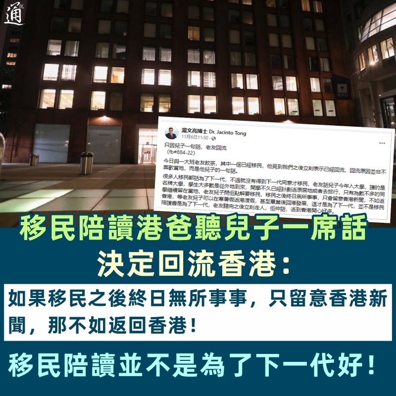 香港新聞網11月14日電 一些港人口口聲聲說移民是“為了下一代”,但他們可知道下一代的真正想法?有移居外國陪子女讀書的港爸就因聽了兒子的一席話,立馬決定回流香港,還表示回港後整個人開心了好多…… 香港紀惠集團副主席及行政總裁湯文亮在社交媒體發文爆料,稱近日與一大幫朋友飲茶,其中一個原本已經移民,但日前又回流香港。說起回流原因,該老友表示並非不喜歡當地,而是因為其兒子的一句話…… 據該老友介紹,其兒子今年入讀名牌大學,同學大多來自外地。開學不久,就有不少人計劃返回原居地或者去旅行,只有為數不多的同學繼續留在當地。 見此,朋友兒子詢問爸爸為什麼要移民,認為如果移民之後終日無所事事,只留意香港新聞,那不如返回香港。移民陪讀並不是為了下一代好。 朋友兒子還表示自己可以在寒暑假返港,甚至畢業後回港發展。朋友聽完兒子一席話,立刻決定走人,並形容自己返回香港後開心好多! 對此,湯文亮感歎道,很多人移民都說為了下一代,其實移民這個決定根本沒有得到下一代的同意!