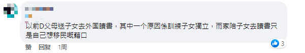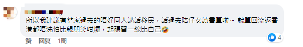 也有網友諷刺那些動輒拿子女當移民擋箭牌的“黃絲”:“所以我建議整家人過去的不要跟人說自己移民,說陪子女讀書算啦。(這樣)就算回流香港都不怕被親朋笑,起碼留一線(後路)給自己!”