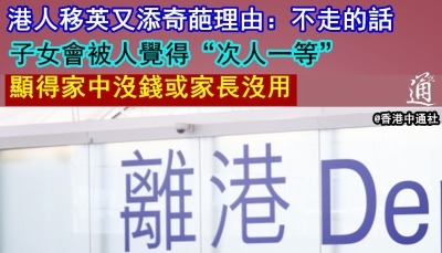 早前,湯文亮還曾分享另一位回流港人的故事。這位港人一家移民去了英國後,原本讀書很厲害的兒子突然放棄學業,理由是父母在香港持有專業資格,又有不錯的職業,移民去了英國都要做最基層的工作。 所以,該移英港人的兒子認為讀書是“多餘”的、念得再多以後在英國也要做最基層的工作……經過深思熟慮後,該移英港人決定舉家回流香港。 一些港人張口閉口為了下一代移民,其實根本未征詢過子女意見。有些香港下一代移居外國後認為進入精英階層無望,放棄奮鬥;還有的下一代,如文中描述的那般,真實想法是日後學成也要回港發展…… 【編輯:李泺】