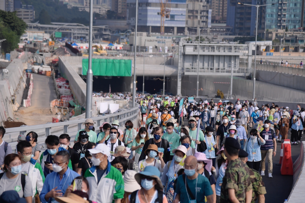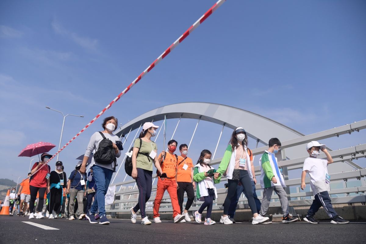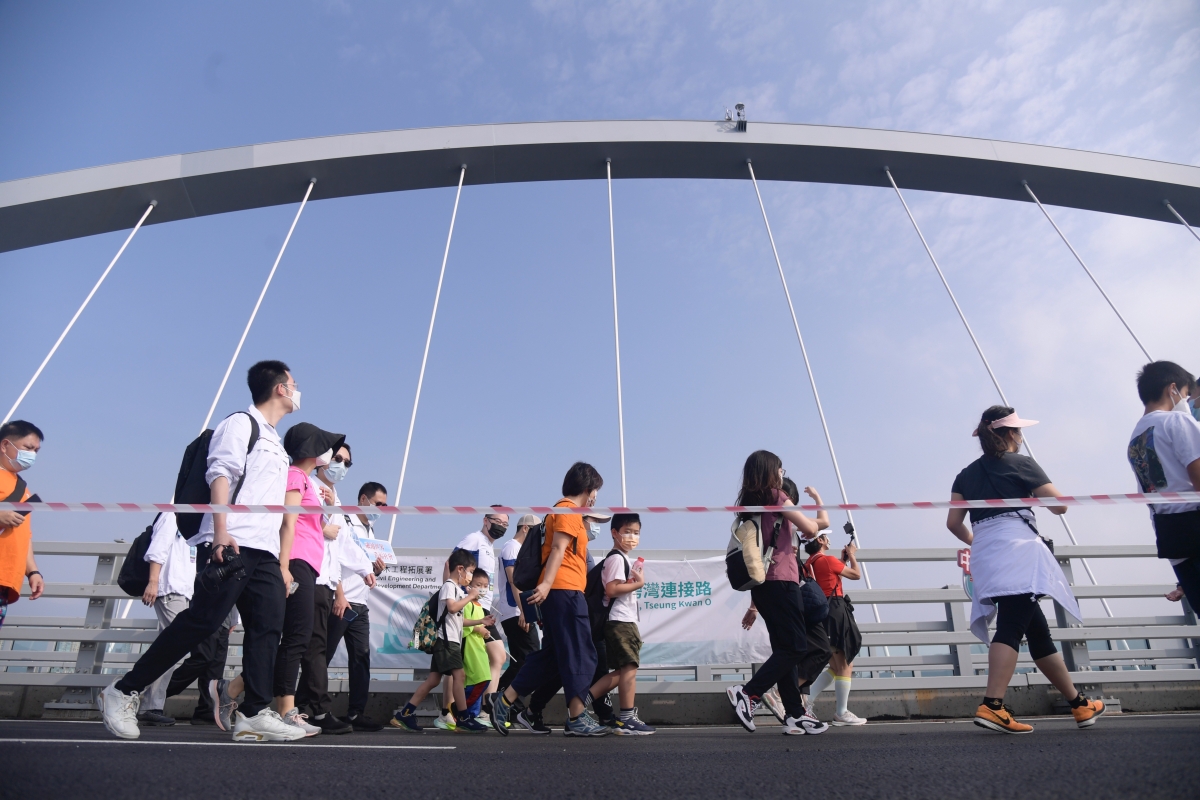 香港新聞網11月20日電(記者 許其皓)因為疫情影響移師線上兩年的香港公益金百萬行11月20日在即將啟用的將軍澳跨灣連接路恢復實體步行籌款,活動全程6公里,行畢時間約1.5小時,市民可以在將軍澳新地標正式啟用前,親身踏足全港首條同時具備行車道、單車徑及行人路的海上高架橋。當日現場人山人海,近15000名市民踴躍參加邁出慈善步伐,為公益金資助的家庭及兒童福利服務籌款。