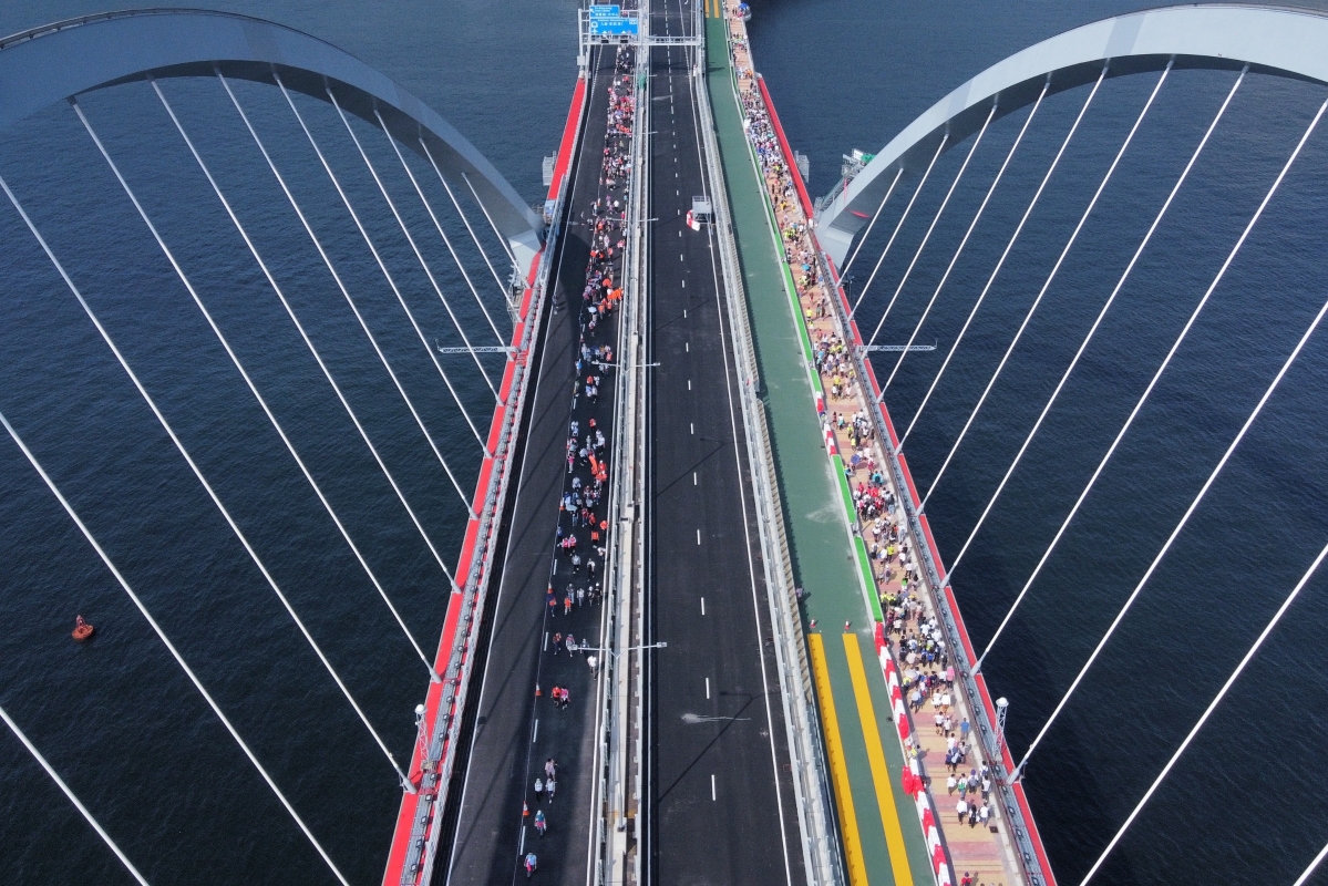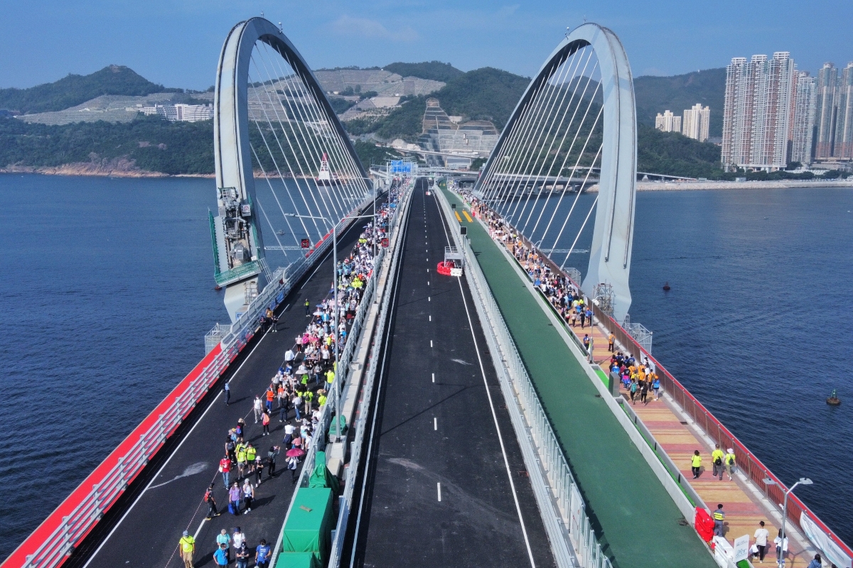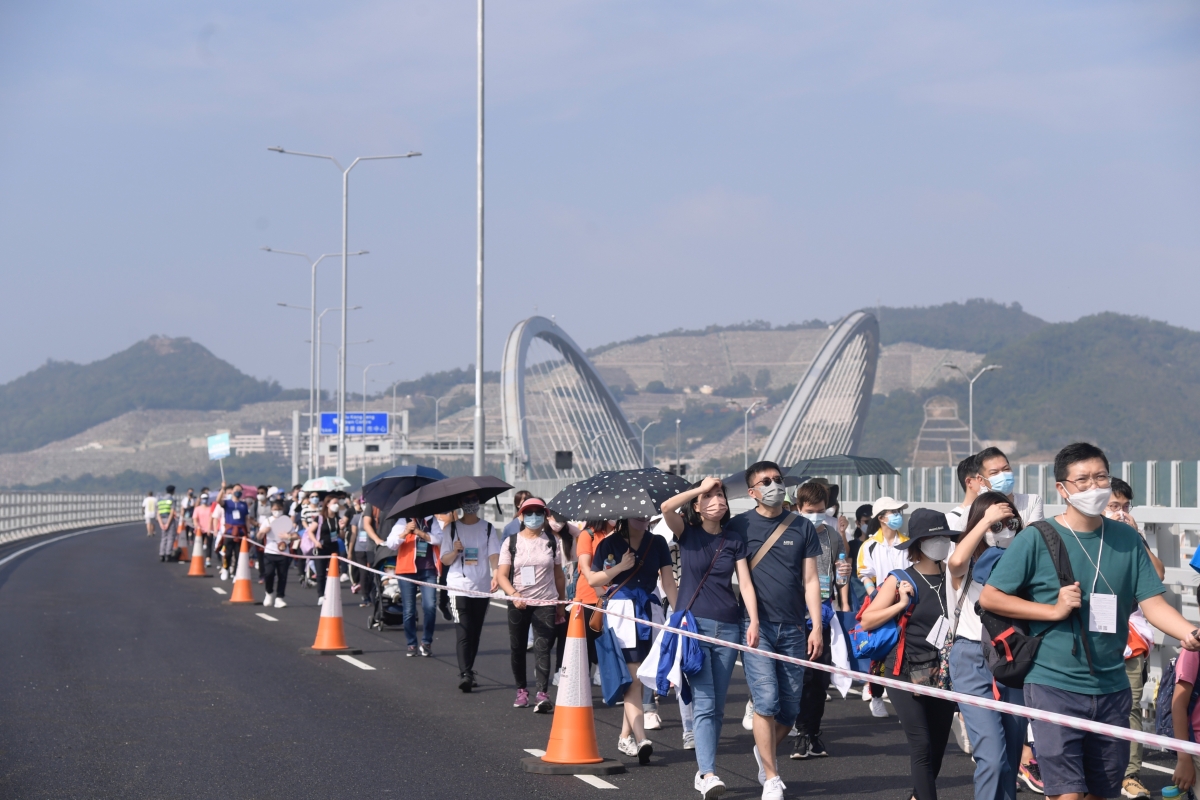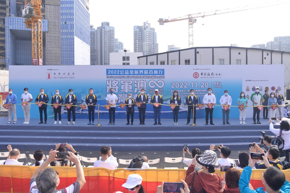 香港新聞網11月20日電(記者 許其皓)因為疫情影響移師線上兩年的香港公益金百萬行11月20日在即將啟用的將軍澳跨灣連接路恢復實體步行籌款,活動全程6公里,行畢時間約1.5小時,市民可以在將軍澳新地標正式啟用前,親身踏足全港首條同時具備行車道、單車徑及行人路的海上高架橋。當日現場人山人海,近15000名市民踴躍參加邁出慈善步伐,為公益金資助的家庭及兒童福利服務籌款。