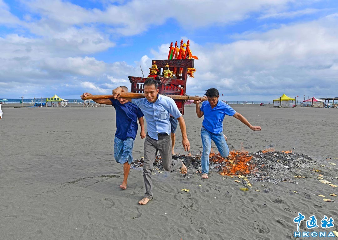 11月18日,台灣宜蘭縣頭城鎮董慶寺舉行董公真人祝壽大典,陣頭從董慶寺出發遊街遶境到頭城海邊進行踩踏火盆,祈求風調雨順,疫情趕快結束。 香港中通社圖片